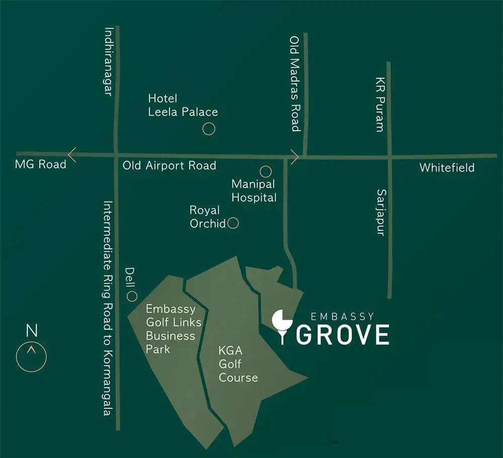 The location map of Embassy Grove highlights its prime position on Old Airport Road, Indiranagar – one of Central Bangalore’s most sought-after residential zones. The project is strategically connected to major IT hubs, business districts, shopping centers, schools, and healthcare facilities, ensuring both convenience and lifestyle advantages.