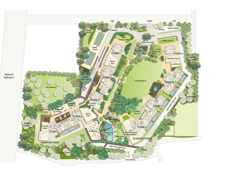Amenities include a clubhouse, business centre, spa, swimming pool, helipad, landscaped gardens, sports courts, meditation hall, jogging track, and 24/7 security.