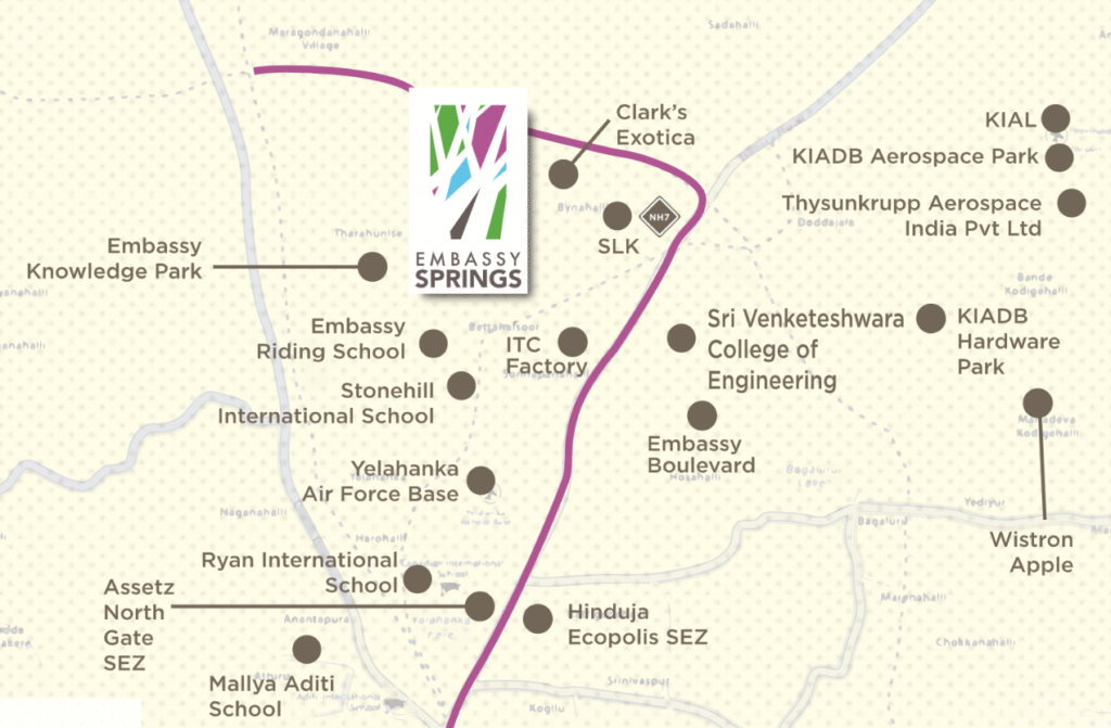 Embassy Springs is located in Devanahalli, off Airport Road, North Bangalore, just 12 km from Kempegowda International Airport.