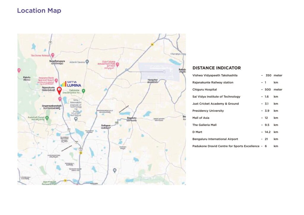 Sattva Lumina is strategically located on Yelahanka–Doddaballapura Road, North Bangalore, offering a peaceful environment with excellent connectivity. The project overlooks Nagadasanahalli Lake and is surrounded by lush greenery, providing a serene residential experience.