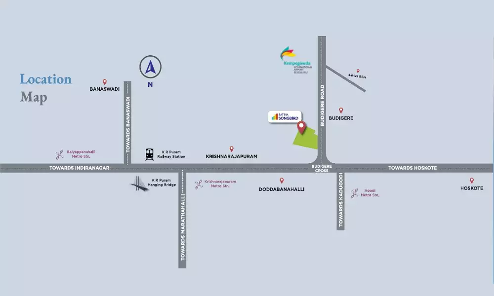 Sattva Songbird is an ultra-premium residential project by the Sattva Group, featuring apartments and row houses near Budigere Cross, just off Old Madras Road in East Bangalore. Spanning 16 acres of prime land, the development offers spacious Studio, 1, 2, and 3 BHK apartments along with luxurious 4 BHK Triplex Villas. With over 80% open spaces and lush green surroundings, the project promises a serene and elite living experience. Ideally located near KR Puram, Whitefield, and key landmarks like Sattva Bliss and Prestige Tranquility, Sattva Songbird ensures excellent connectivity. Thoughtfully designed amenities include a clubhouse, swimming pool, gym, sports courts, party hall, kids’ play area, landscaped gardens, and 24/7 advanced security—delivering a premium and self-sustained lifestyle.